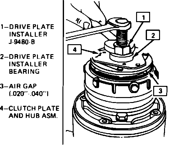 3. Using tool J-9480-B, press hub onto shaft until there is approximately .020 to .040 inch clearance between clutch plate and rotor frictional surfaces, Fig. 5.