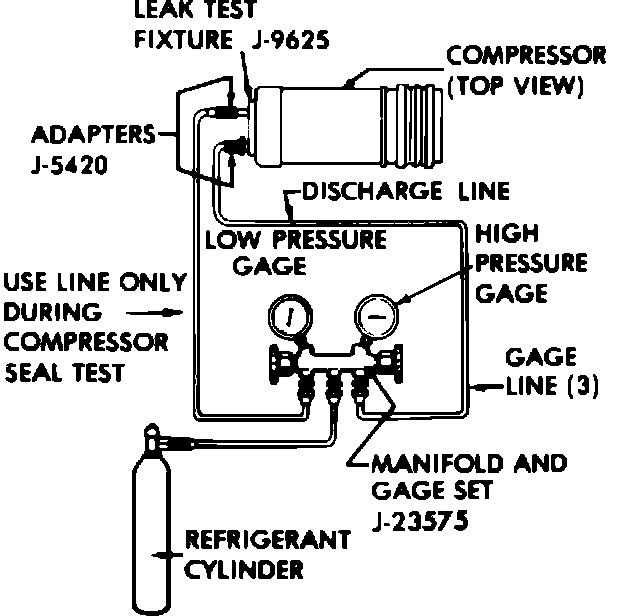 6. Install Compressor Leak Test Fixture J-9625 and connect gauge charging lines, Fig. 12. Pressurize suction side of compressor to drum pressure. Temporarily install shaft nut and with compressor horizontal and sump down, rotate compressor shaft several times in normal direction of rotation checking for leaks around seal area using a torch type leak detector. Correct any leaks found, remove and discard shaft nut.