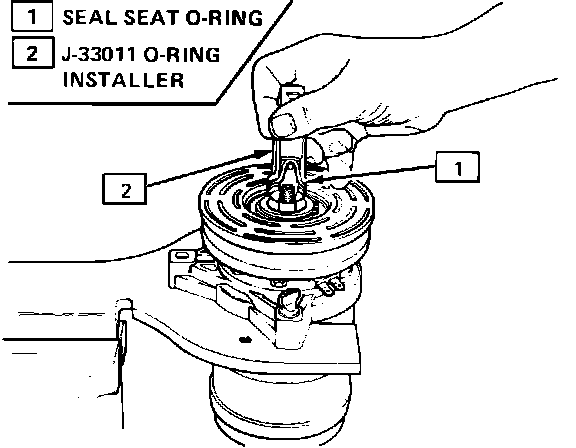 2. Insert O-ring installer into compressor neck. When installer bottoms, lower moveable slide of installer to release O-ring into seal seat lower O-ring groove (top groove is for shaft seal retainer ring). Rotate installer to seat O-ring and remove installer.