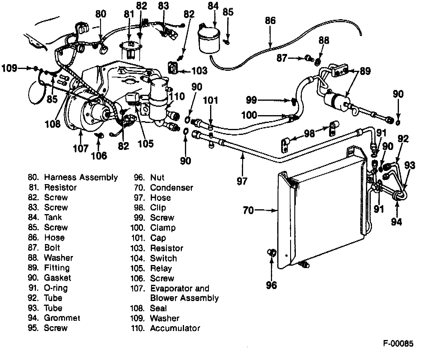 The high pressure fitting is located either in the high pressure vapor line or muffler, while the low pressure fitting is located on the accumulator.