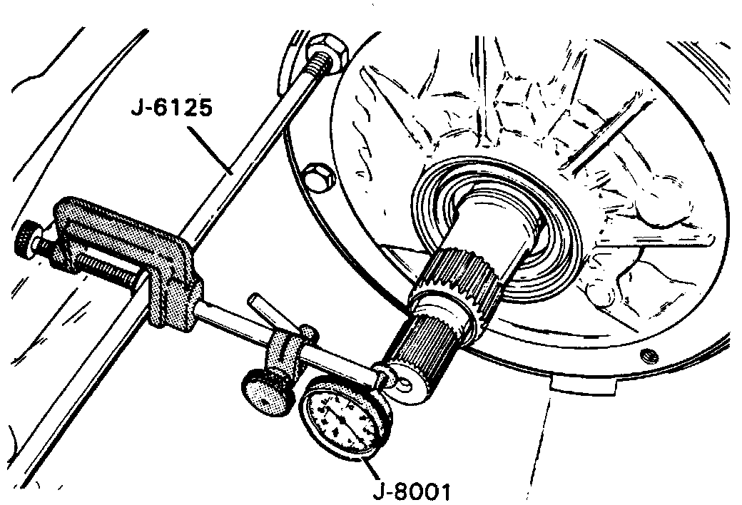 6. Select correct washer and remove tools. Front end play check must be repeated during assembly of transmission to verify accuracy.