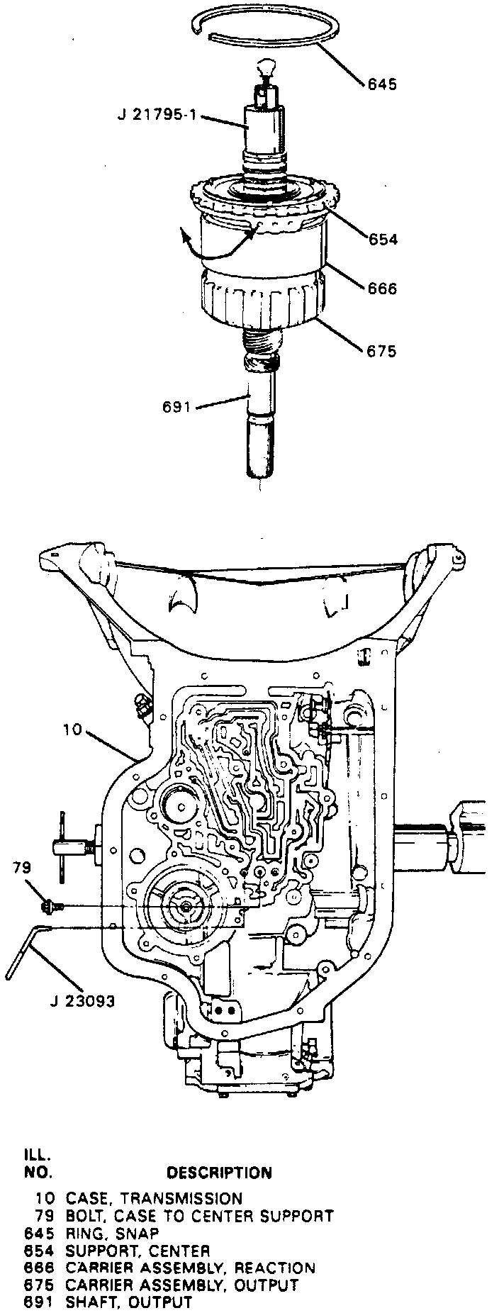 16. Insert tool J-23093 or equivalent into center support direct clutch passage through case, then apply pressure to tool J-23093 in direction of arrow, Fig. 37, seating center support splines against case splines.
