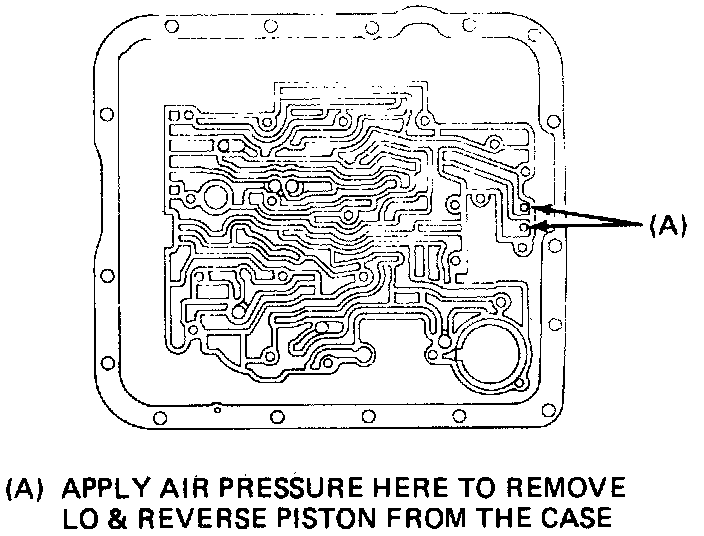 21. Remove lo and reverse clutch piston by applying compressed air to case passage as shown in image.