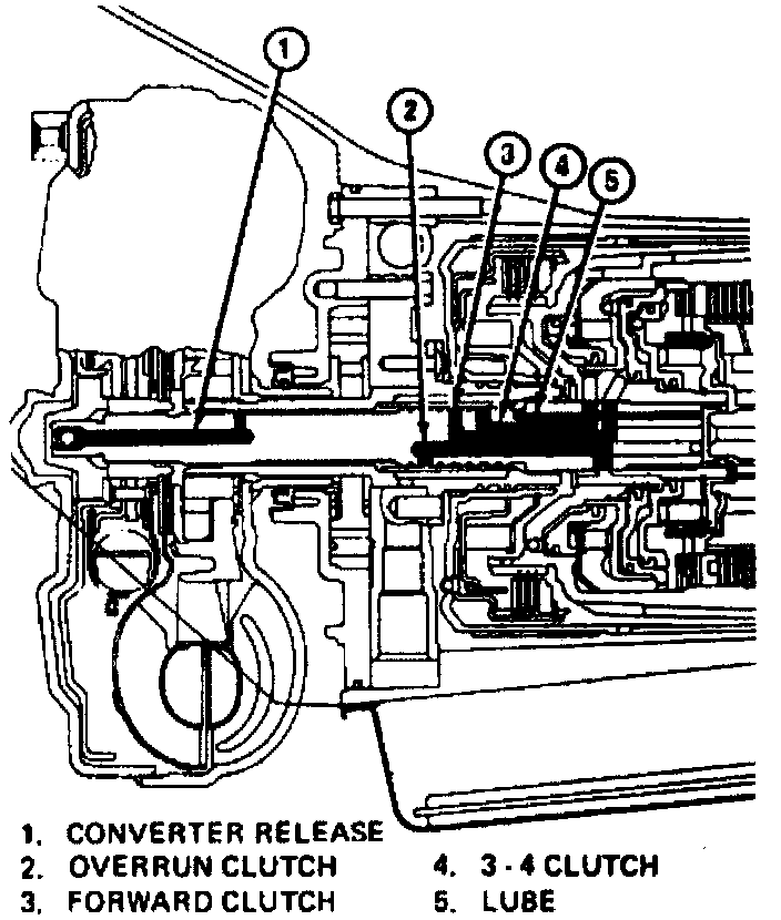 1. Air check the 3-4, forward and overrun clutches by applying air pressure at the oil feed holes in the turbine shaft. When the overrun clutch is checked, air will blow by the forward clutch piston lip seals and exit out the forward clutch feed hole in the turbine shaft.