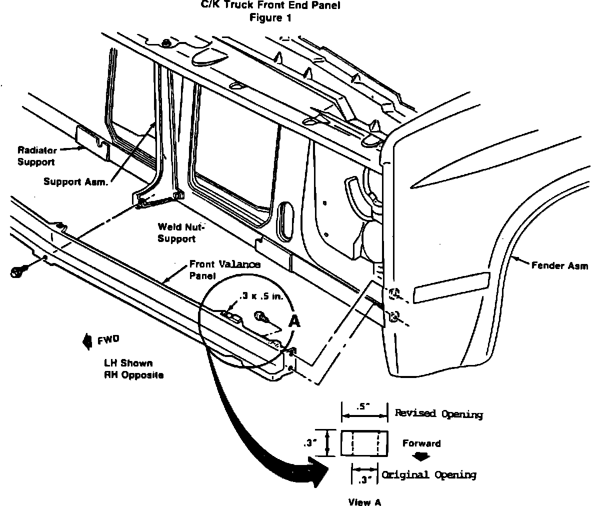 3. Use a nibbling tool to slot the two outer valance panel holes .1 inch on each side, in the cross vehicle direction (See Figure No. 1 View A). This will change the square .3 x .3 inch hole to a rectangular .3 x .5 inch hole.