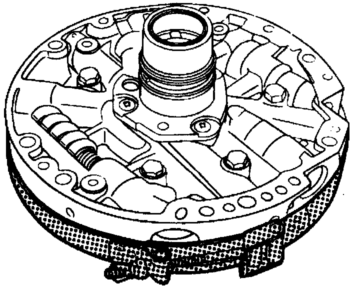 10. Install oil pump assembly attaching bolts and washers, then torque bolts to specification. Rotate transmission to a horizontal position. If transmission is assembled properly, turbine shaft should turn by hand. If not, identify problem and correct.