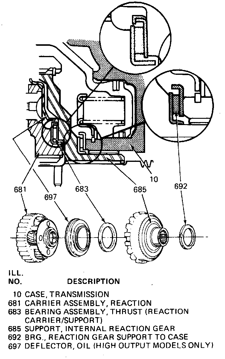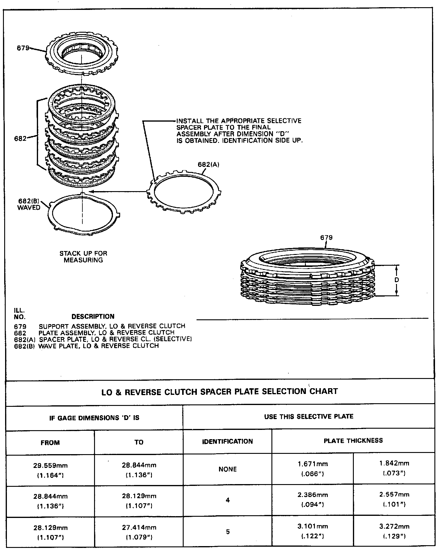 b. On a flat work surface, stack up the following lo and reverse clutch assembly components; 1 waved plate, 5 fiber plates and four steel plates starting with one fiber plate and then alternating with a steel plate. Then position lo and reverse clutch support assembly. Apply an evenly distributed load to the top of the lo and reverse support assembly (number 679). A light pressure of approximately 5 lbs., on the lo and reverse support assembly will provide the correct dimension for measurement. Do not apply excessive pressure. Measure height of the clutch pack from the work surface to the top of the lo and reverse clutch support (number 679). Use dimension "D", to select the proper thickness of the selective spacer plate for assembly. Install the proper selective spacer plate between the wave plate and first fiber clutch plate with the identification point facing upward. The overall height for dimension "D" with the selective spacer plate included should be 1.20 - 1.24 inch.