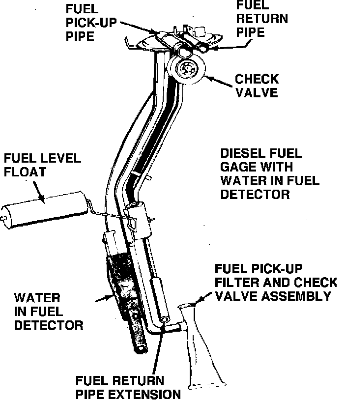 The Water In Fuel warning system employs an electronic water detector mounted inside the fuel tank on the fuel gauge sending unit. The detector provides a warning when 1---21/2 gallons of water are present in the fuel tank by lighting a warning lamp on the instrument panel. The sending unit assembly also contains a provision for siphoning off water in the fuel tank through the fuel return line, Fig. 4.
