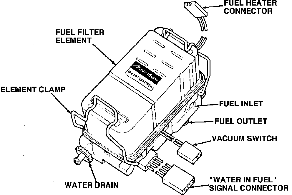 The Water In Fuel warning system employs a fuel detector integral with the fuel filter and fuel heater, Fig. 5, and mounted on the engine. When more than 2.2 ounces of water has collected in the filter, the Water In Fuel lamp on the instrument panel will light. After the light comes on, the filter should be drained as soon as possible and must be drained within 2 hours of operation.