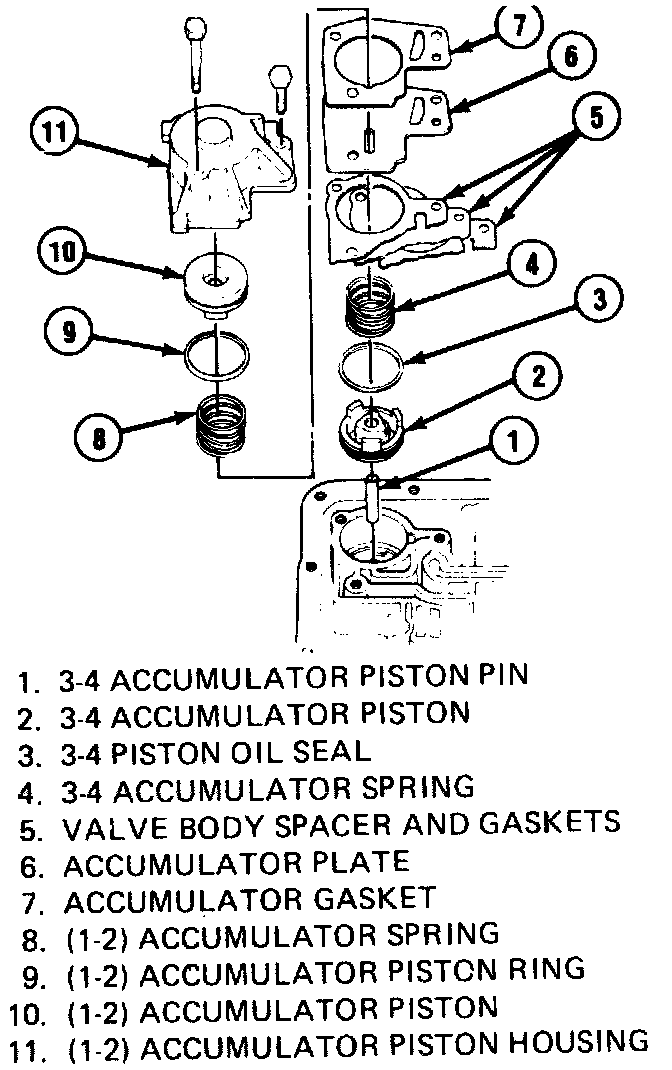 1. Install 3-4 accumulator pin into case, then the 3-4 accumulator piston seal onto the 3-4 accumulator piston.