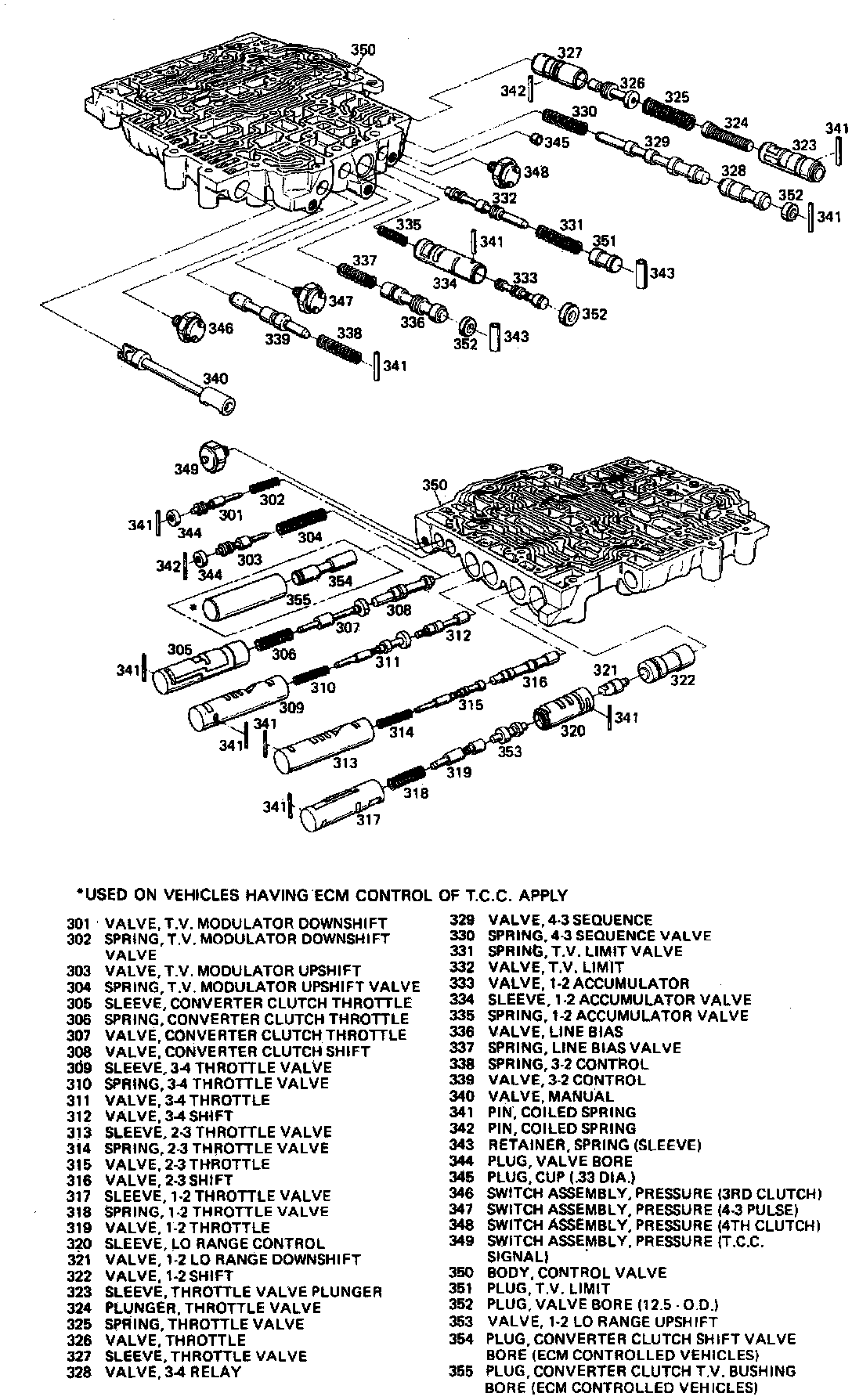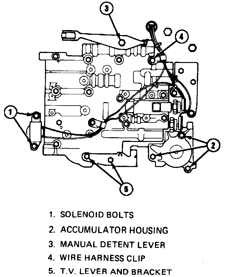 12. Install wiring harness clips, filter retaining clip, manual spring assembly, wire retaining washer and remaining valve body to case attaching bolts. Torque attaching bolts to 8 ft lbs.