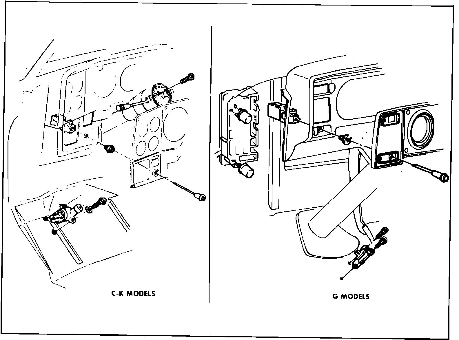 3. Remove left side instrument cluster bezel screws, then pull outward on bezel and hold switch retaining nut with wrench, Fig. 9.