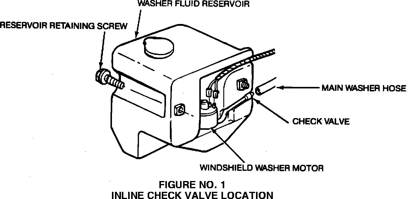 A component part of the washer system is an inline check valve mounted to the reservoir assembly (See Figure No. 1). The function of the check valve is to keep the hoses between the reservoir and the nozzles full of fluid. Without the check valve, the fluid in the system hoses could drain back to the bottle causing a slight delay in fluid delivery to the windshield.