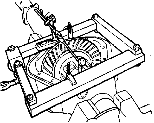 4. Install a dial indicator on ring gear side of carrier with indicator button contacting back of ring gear.