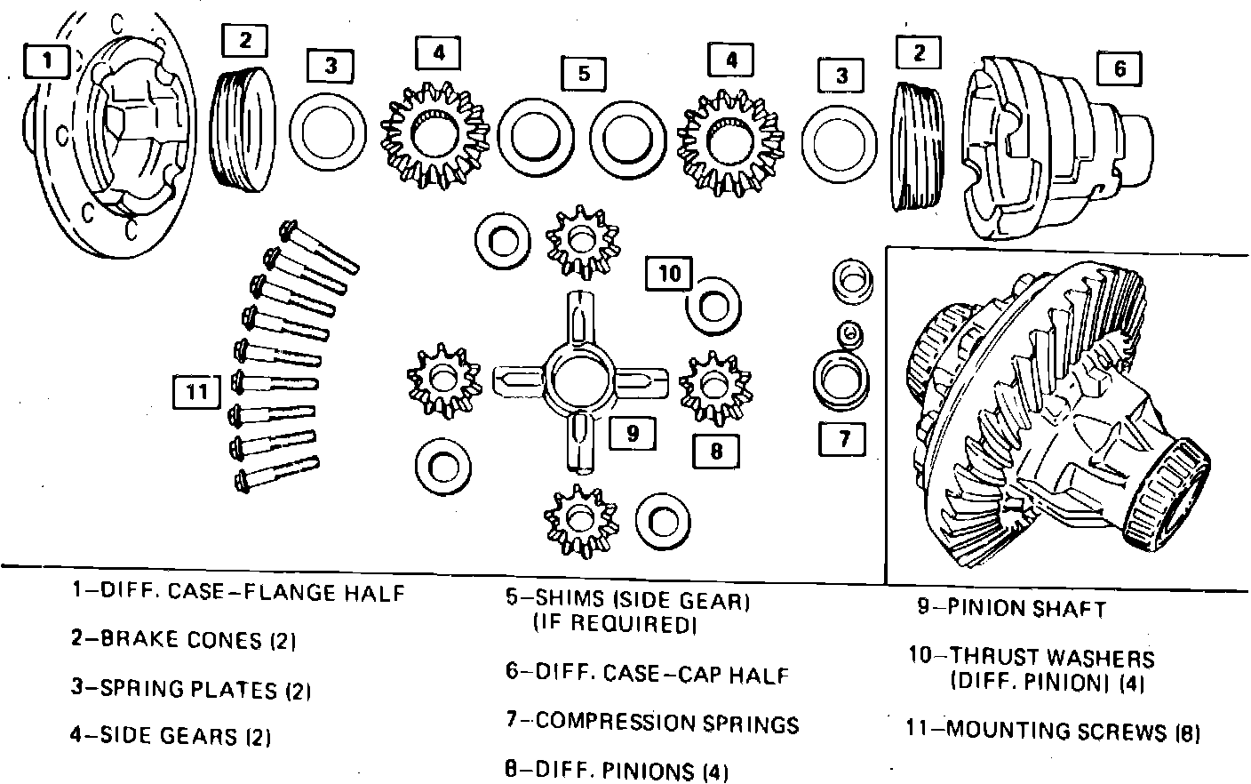 3. Scribe alignment marks on brake cones and shims, then remove pinion shaft, four differential pinions, thrust washer side gears, side gear shims if required, spring plates, compression springs and brake cones from housing, Fig. 2. Discard used compression springs.