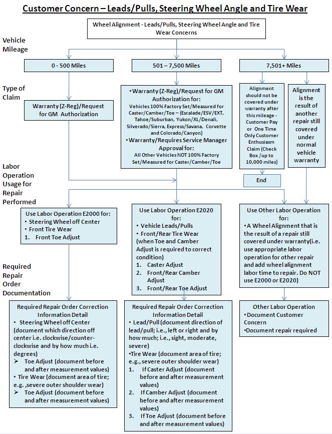 The following flowchart is to help summarize the information detailed in this bulletin and should be used whenever a wheel alignment is performed.