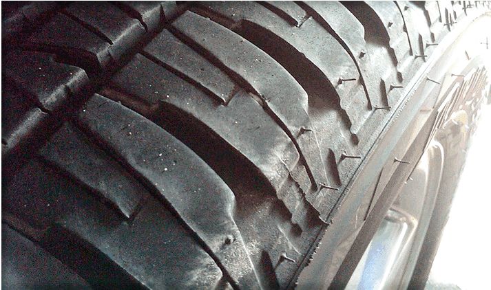 - RF and LF tires are wearing on the outside shoulders with severe feathering.