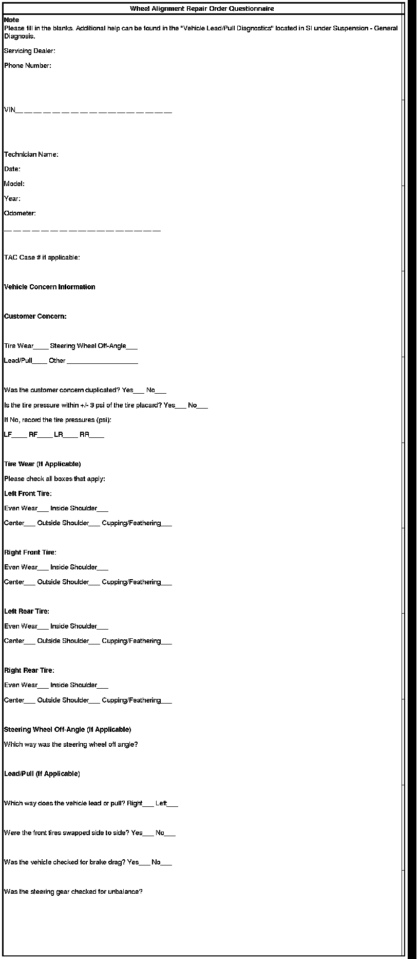 - Completed "Wheel Alignment Repair Order Questionnaire" (form attached to this bulletin)
