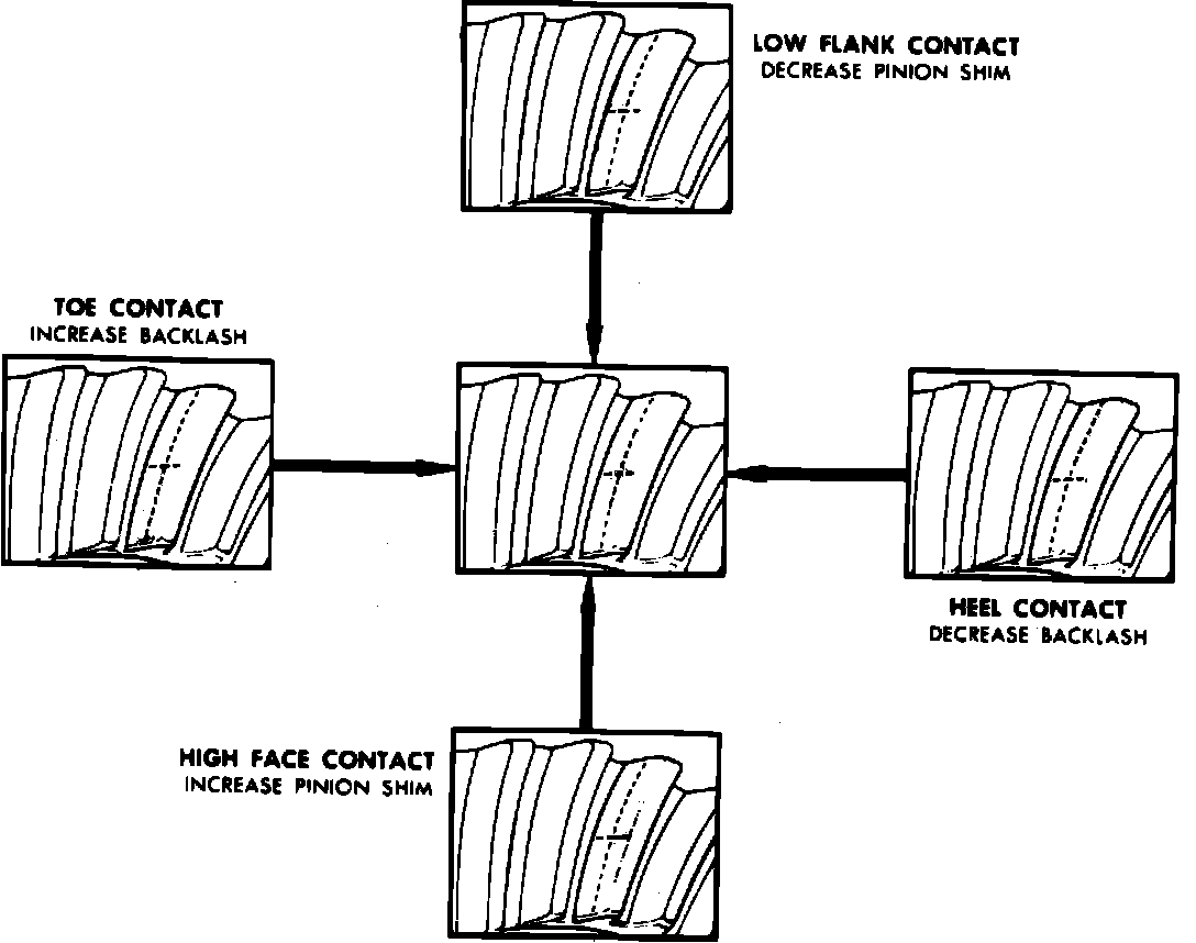 13. Examine gear tooth contact pattern, referring to Fig. 12, and correct assembly adjustments as needed.