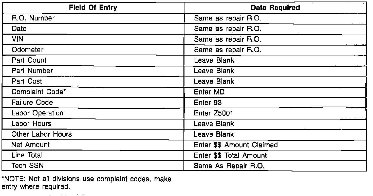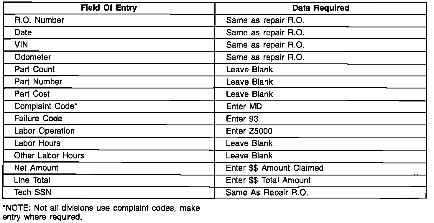 The following example utilizes an evaporator core as the required part. In the example, the dealer/retailer purchased the part from another dealer/retailer for $240.00. The repairing division will compensate the dealer/retailer for the dealer net plus the normal parts allowance (30% for 93 and prior, 40% for 94 and future) $199.80 + 59.94 = $259.74 as part of the regular labor operation D3320. The additional part cost over and above dealer price, ($240.00 - 199.80 = $40.20) should be submitted under labor operation Z5000 as a net amount.