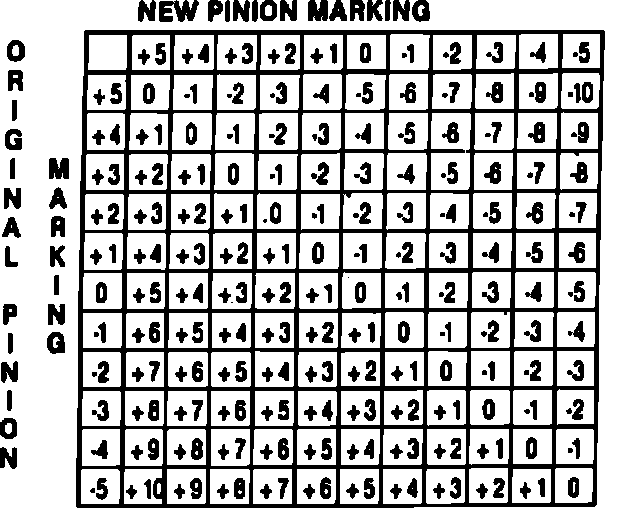 When a new pinion is installed, shim pack thickness can be determined using the pinion code numbers and chart, Fig. 7.