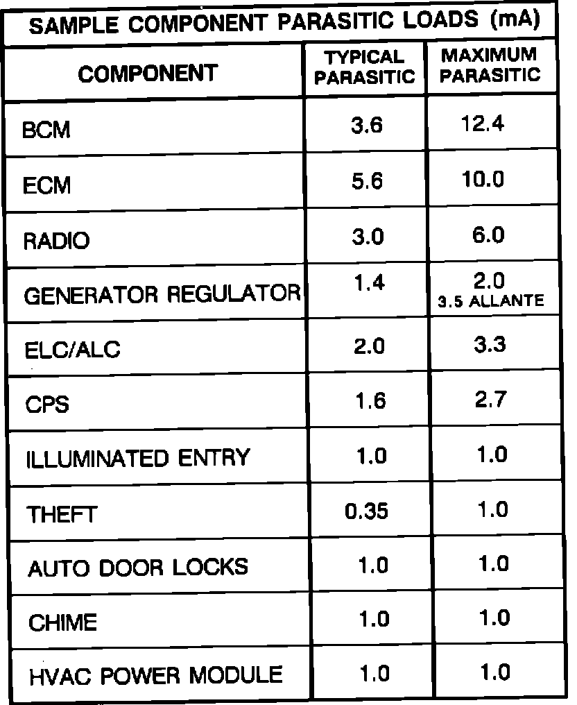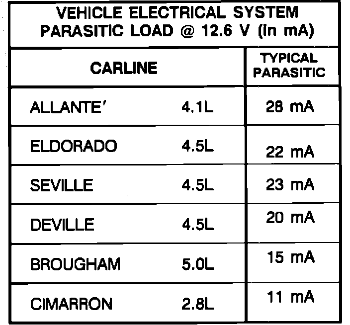 As was discussed previously in "Battery Storage", today's Cadillacs have several electronic devices which result in very small but continuous current drains on their batteries, commonly referred to as "parasitic loads". A parasitic drain of up to 50mA is considered normal, 30mA being about average. Any battery draw above 50mA, with ignition off and retained accessory power disabled (if so equipped), is excessive. Figure 4 gives approximate average values of design parasitic current draw for each carline.