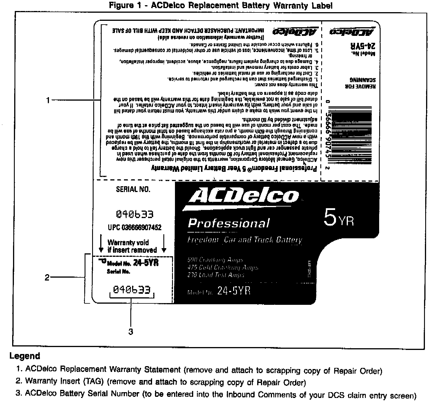 Again, the aftermarket AC Delco Consumer Battery Warranty does not apply and the Dealer is to remove the warranty statement and warranty insert from the new replacement battery and retain for future reference as covered in Article 1.5.10c of the GM Service Policies and Procedures Manual. (See Figure 1).