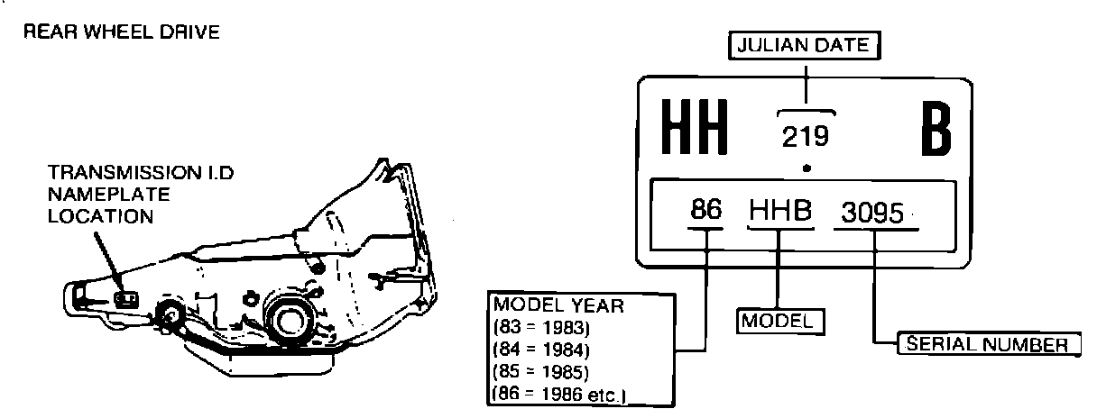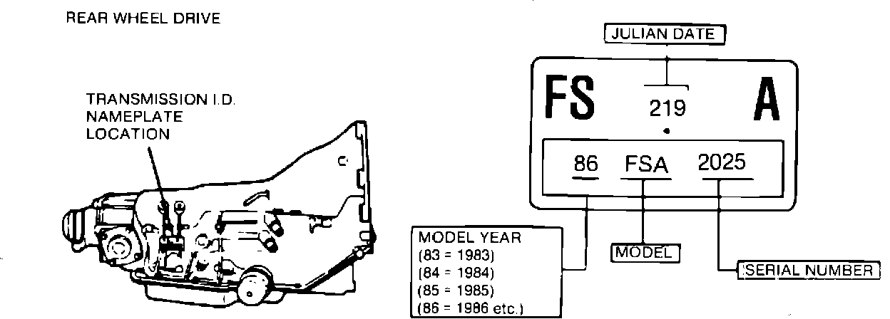 This information is intended to assist field technicians in understanding the transmission identification (I.D.), its meaning, and where it is located on currently manufactured THM automatic transmissions. The transmission identification tag or stamped identification contains such information as transmission type, model year, model, serial number, and Julian date.. Refer to the following information and illustrations which will help explain all transmission identifications: