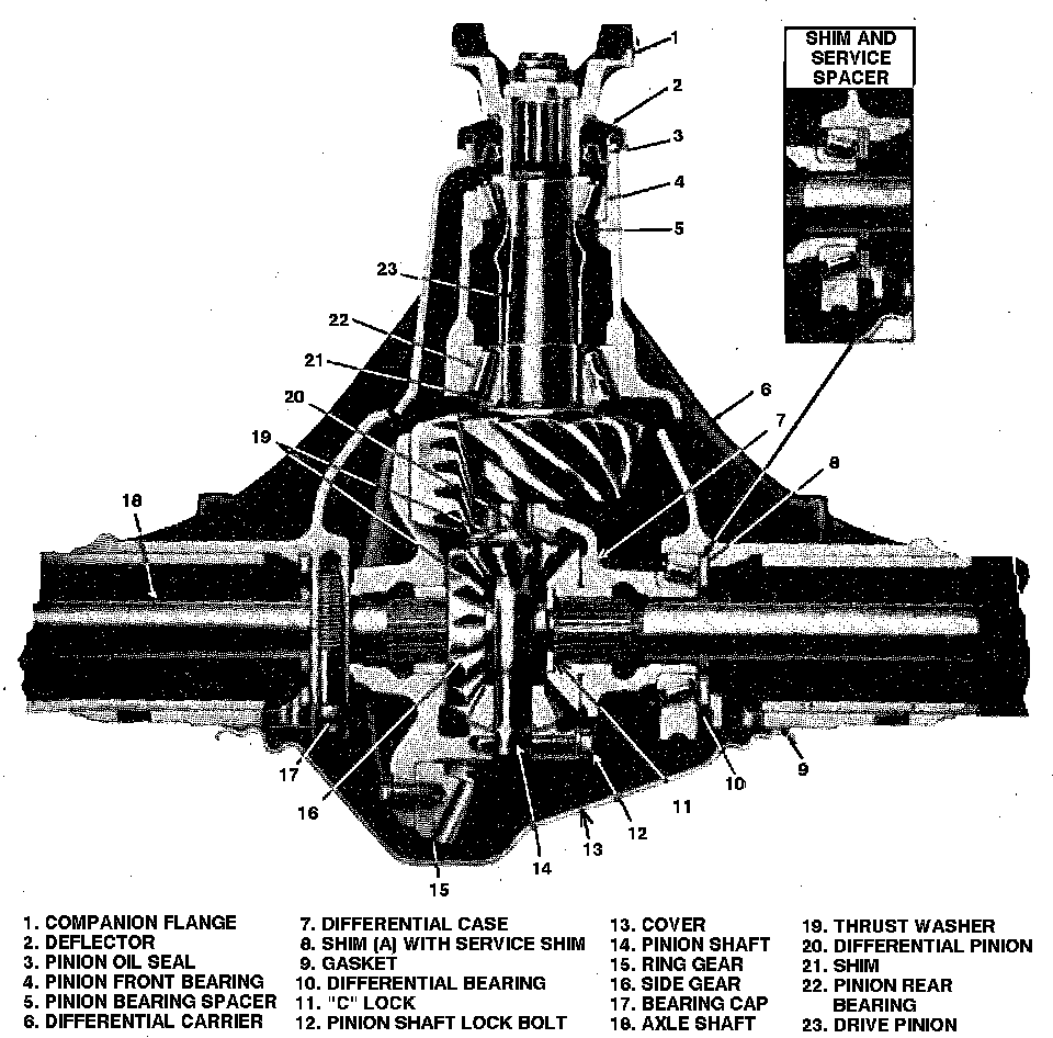 The differential is supported in the carrier by two tapered roller side bearings. These bearings are preloaded by spacers located between the bearings and carrier housing. The differential assembly is positioned for proper ring gear and pinion backlash by varying these spacers. The differential case houses two side gears in mesh with two pinions mounted on a pinion shaft which is held in place by a lock pin. The side gears and pinions are backed by thrust washers.