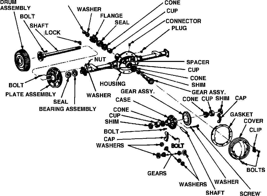 In these axles, the axle housing and differential carrier are cast into an integral assembly. The drive pinion assembly is mounted in two opposed tapered roller bearings. The pinion bearings are preloaded by a spacer behind the front bearing. The pinion is positioned by a washer between the head of the pinion and the rear bearing.