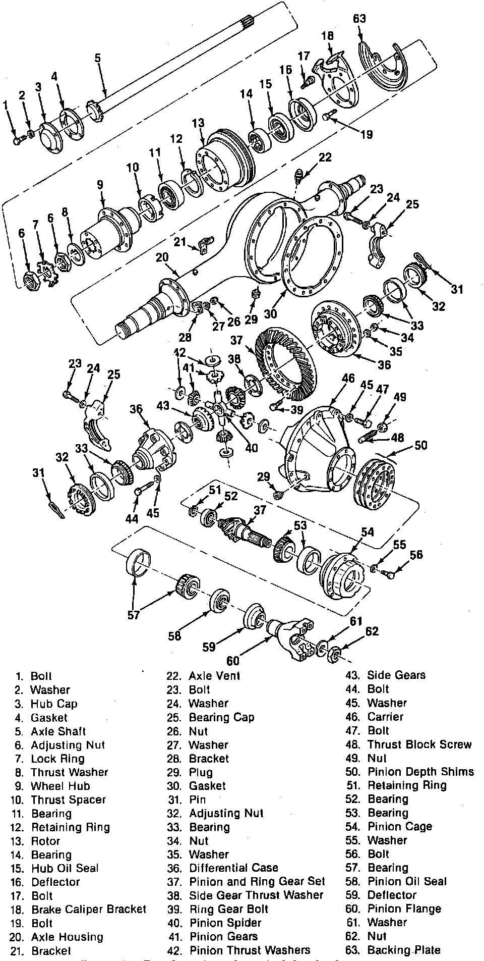This axle, Fig. 13, employs a heavy duty hypoid drive pinion and ring gear. The differential and gear assembly is mounted on tapered roller bearings. The straddle mounted pinion has two tapered roller bearings in front of the pinion teeth which take the forward and reverse thrust, while a third bearing behind the pinion teeth carries the radial load.