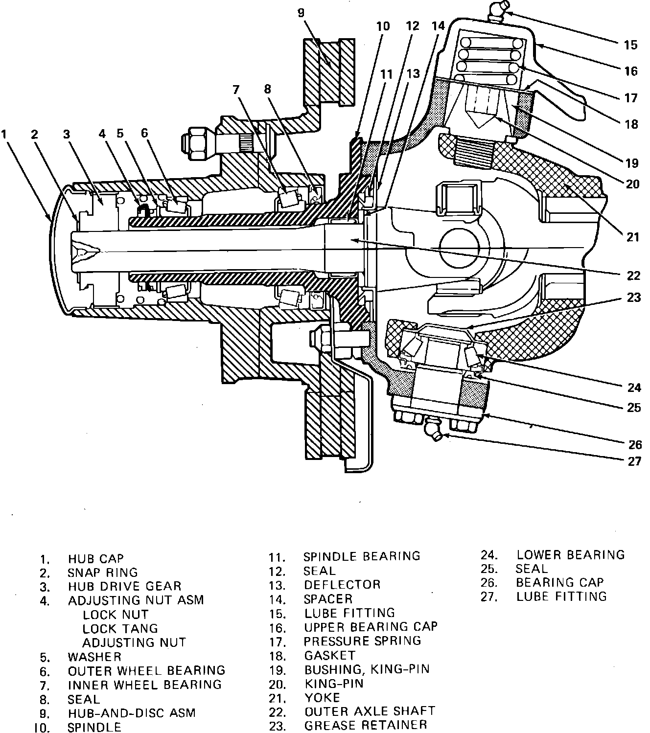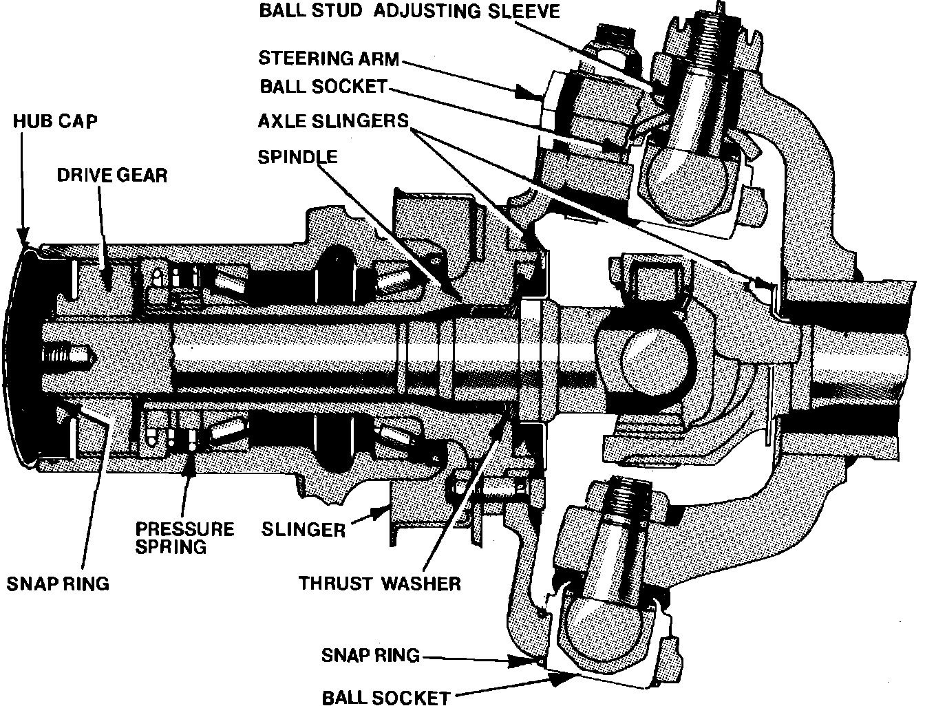 The front axles on these vehicles, Figs. 1 and 2, are hypoid gear units equipped with steering knuckles retained by either ball joints (K10---20/1500---2500) or king pins (K30/3500). The axle shafts drive the front wheels through yoke and trunnion type universal joints.