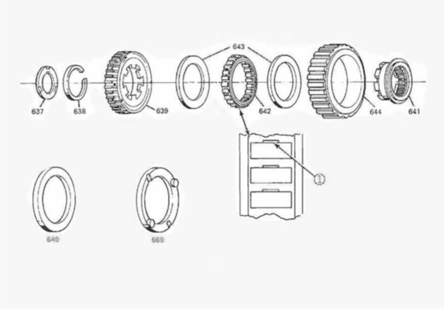 The wear plate (640) and input thrust washer (660) are not required with the new sprag. Use of the thrust washer and wear plate with the new sprag assembly will cause a misbuild (correct end play cannot be obtained).