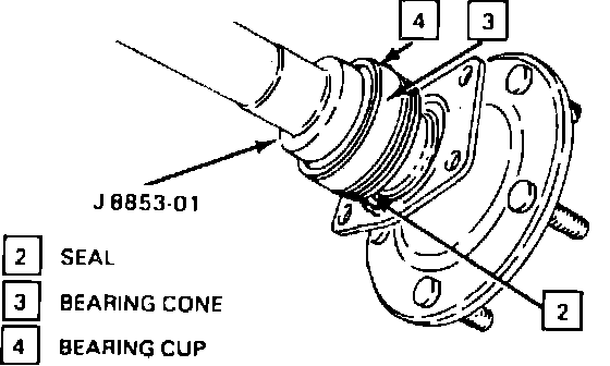 5. To replace axle shaft bearing, split inner retainer with a suitable chisel, then remove retainer from axle shaft, Fig. 2. Using Tool No. J-22912-01 or equivalent, press bearing and seal from axle shaft.