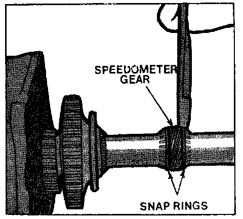 4. Remove snap ring, then slide speedometer gear from mainshaft, remove second speedometer gear snap ring.
