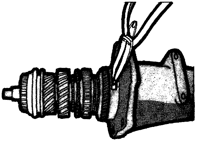 7. Remove reverse idler gear stop ring and, using a long drift, drive idler shaft and woodruff key out through rear of case.