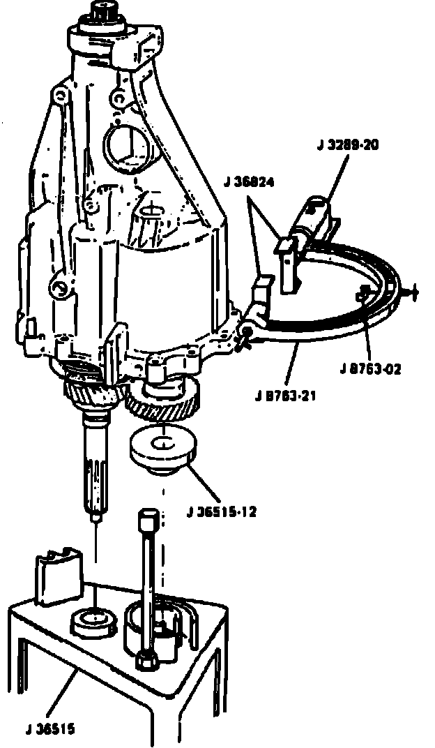 18. Install assembly pallet with countershaft adapter tool No. J-36515 with tool No. J-36515-12, Fig. 6 and remove tool No. J-8763-02 and tool No. J-36824. Remove two interlock balls (323).