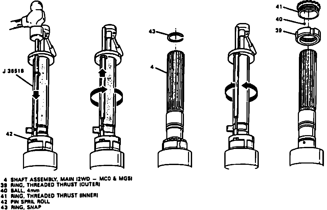 20. Remove snap ring (43), inner threaded thrust ring (41), ball (40) and out threaded thrust ring (39). Hold countershaft against mainshaft and turn output shaft spanner tool No. J-36516, Fig. 9, clockwise until both threaded thrust rings are completely apart.