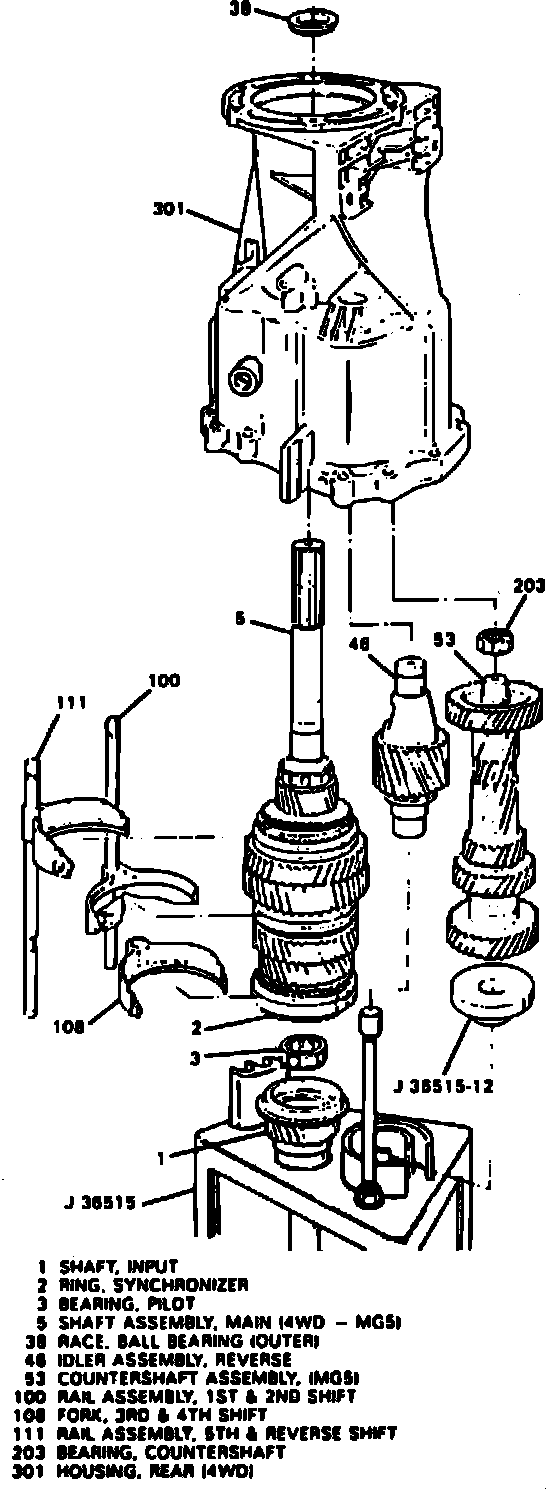 19. Lock up transmission in 2nd and 4th gear by sliding 1st and 2nd shift rail assembly (100) and 3rd and 4th shift fork (108) downward towards assembly pallet tool No. J-36515. Remove spiral roll pin (42) using output shaft spanner tool No. J-36516, Figs. 9 and 10.