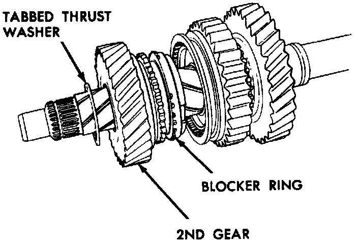2. Slide third gear off mainshaft, then remove snap ring from second gear and remove tabbed thrust washer, second gear and blocker ring from mainshaft.