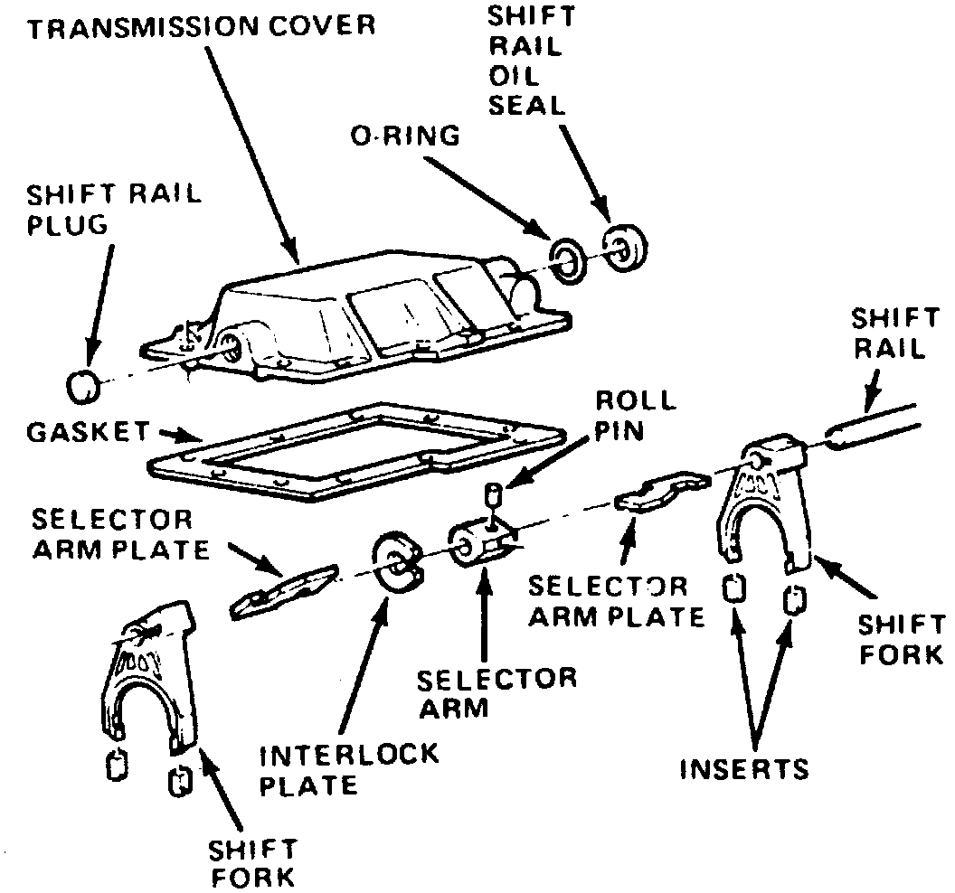 1. Install selector arm plates and nylon inserts in shift forks, then coat edges of shift rail plug with suitable sealer and install plug.