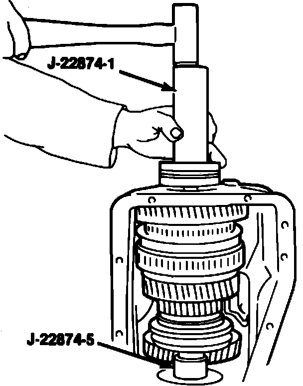 3. Install mainshaft (250) into case. Ensure rear of mainshaft is through rear bearing hole. Position bearing installation tool No. J-22874-5 into front bearing hole as shown in Fig. 3. Ensure that 1st speed gear thrust washer is in position.