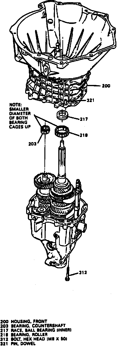 15. Install rear housing assembly (301), ensuring that reverse idler shaft is lined up with hole in case. Bring housing straight down, if resistance is felt at about 1/4 inch, then rollers (35) or (203) are cocked. Repeat above procedures to install, do not force housing down.