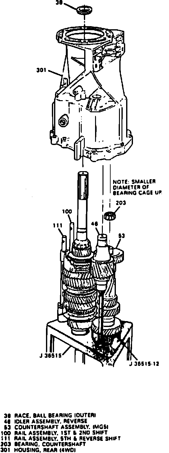 13. Install rear housing assembly (300), ensuring that reverse idler shaft is lined up with hole in case. Pull up on output shaft bearing retainer alignment cables tool No. J-36515-10 while installing rear housing. Bring housing straight down. If resistance is felt at about 1/4 inch, then rollers are cocked. Repeat above procedures to install. Do not force housing down. Remove output shaft bearing retainer alignment cables tool No. J-36515-10 when housing is installed.