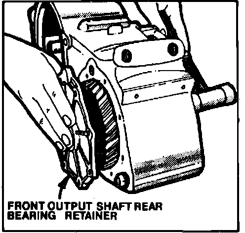 8. Remove front bearing retainer attaching bolts and retainer, then rear bearing retainer attaching bolts from front output shaft.