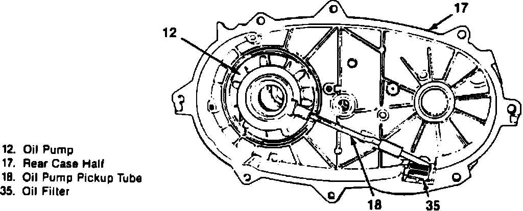 9. Remove oil pump, pickup tube, O-ring and filter from rear case half.