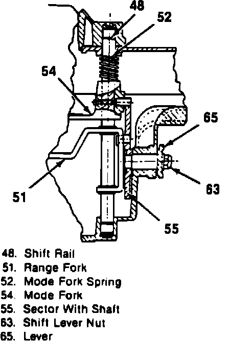 14. Remove range shift fork and range shift hub and sector with shaft from planetary carrier. It is necessary to rotate sector with shaft to provide clearance when removing fork (51), Fig. 19.