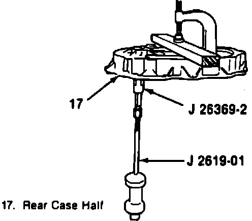 24. Remove front output rear bearing from rear case half using J-2619-01 and J-29369-2 on models 231 and 233. On model 241, insert J-29369-2 behind needle bearings and using J-2619-5, hammer the bearing from case.